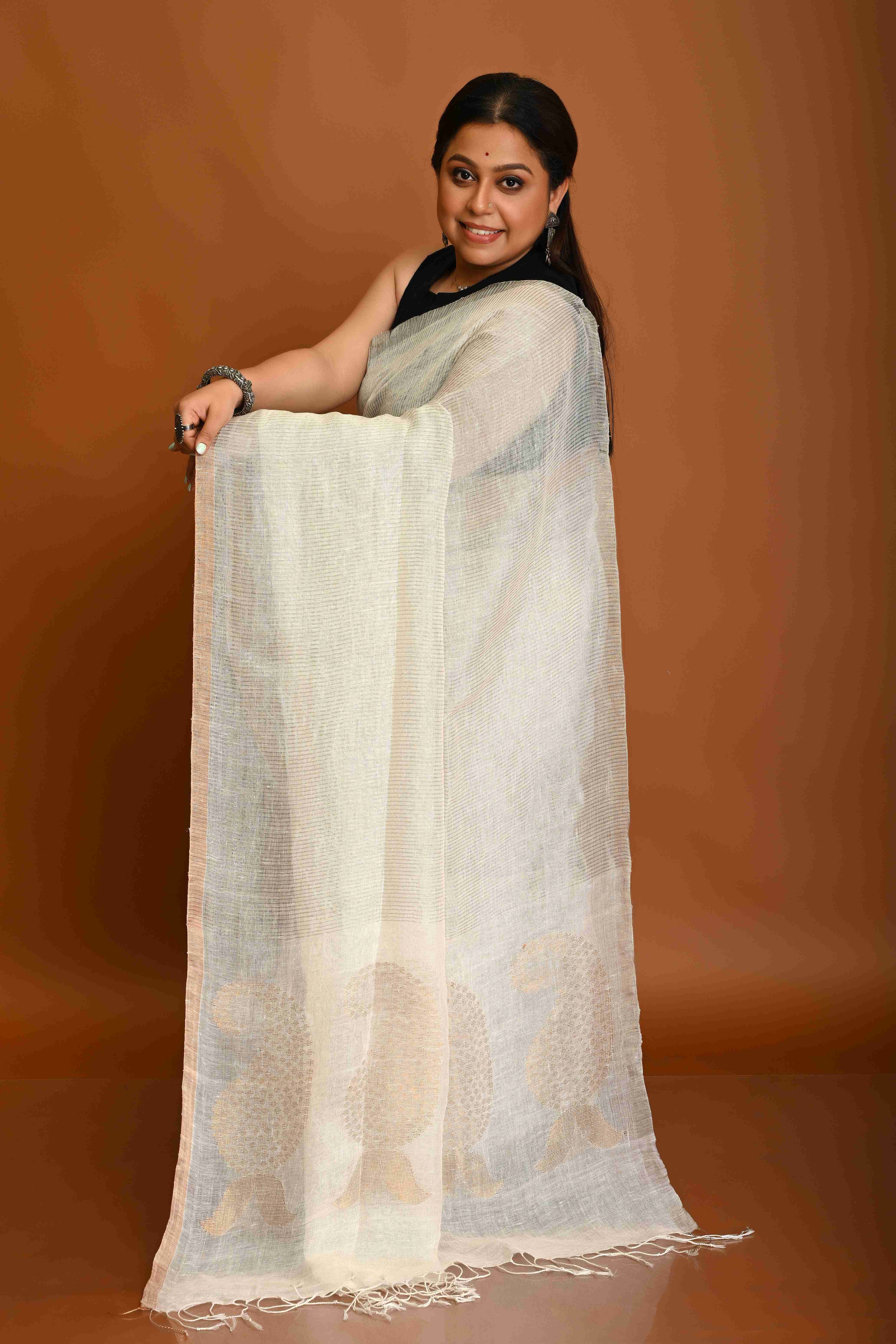 Elevate your wardrobe with this exquisite Pure Linen White Jamdani Saree, crafted from premium 120-count linen for unmatched softness and breathability. The saree features a beautifully woven Aam Kolka motif on the pallu, symbolizing timeless tradition and grace. The body is adorned with subtle stripes, adding a touch of modern elegance to its classic silhouette. Perfect for both festive occasions and everyday luxury.