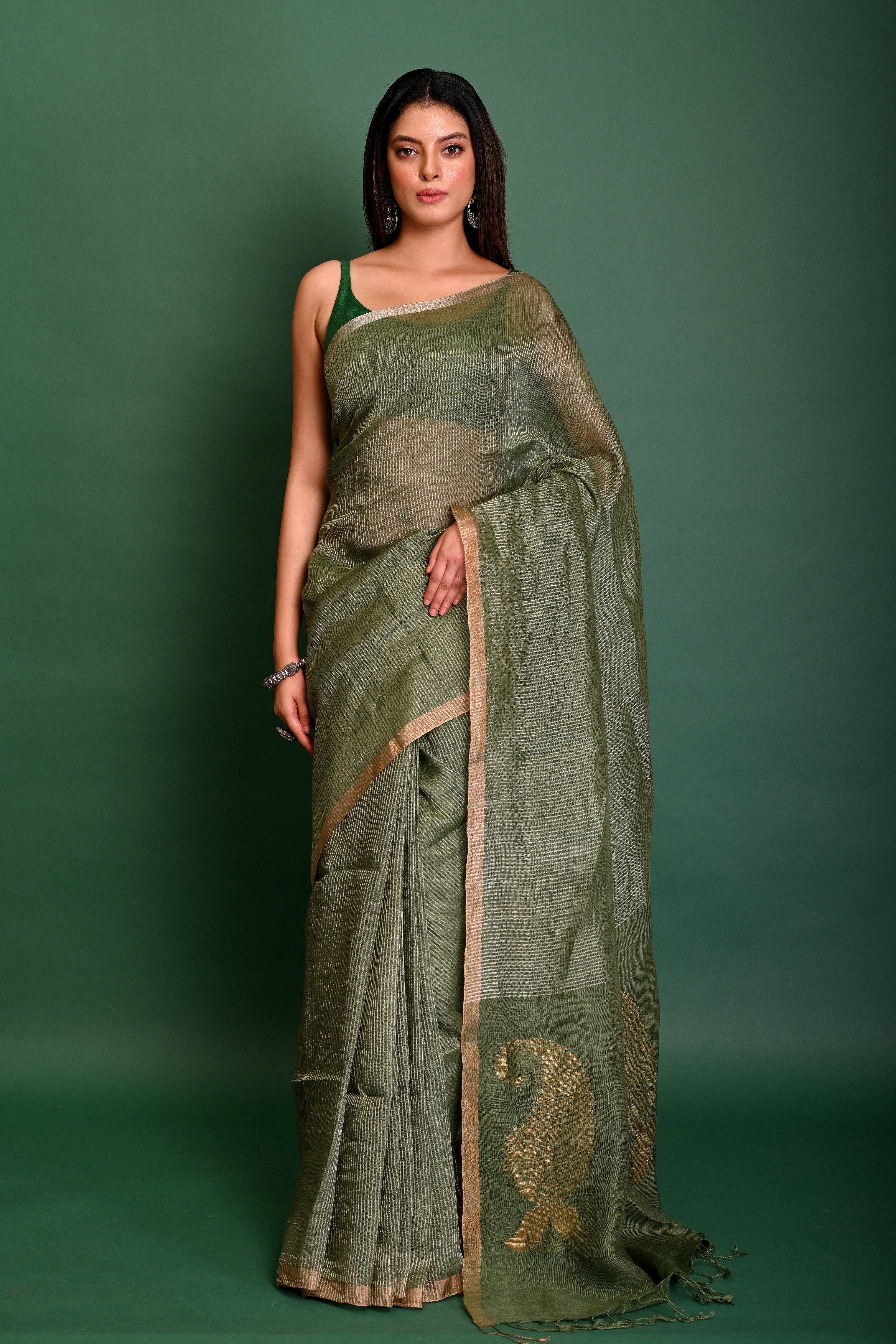 Elevate your wardrobe with this exquisite Pure Linen Green Jamdani Saree, crafted from premium 120-count linen for unmatched softness and breathability. The saree features a beautifully woven Aam Kolka motif on the pallu, symbolizing timeless tradition and grace. The body is adorned with subtle stripes, adding a touch of modern elegance to its classic silhouette. Perfect for both festive occasions and everyday luxury.