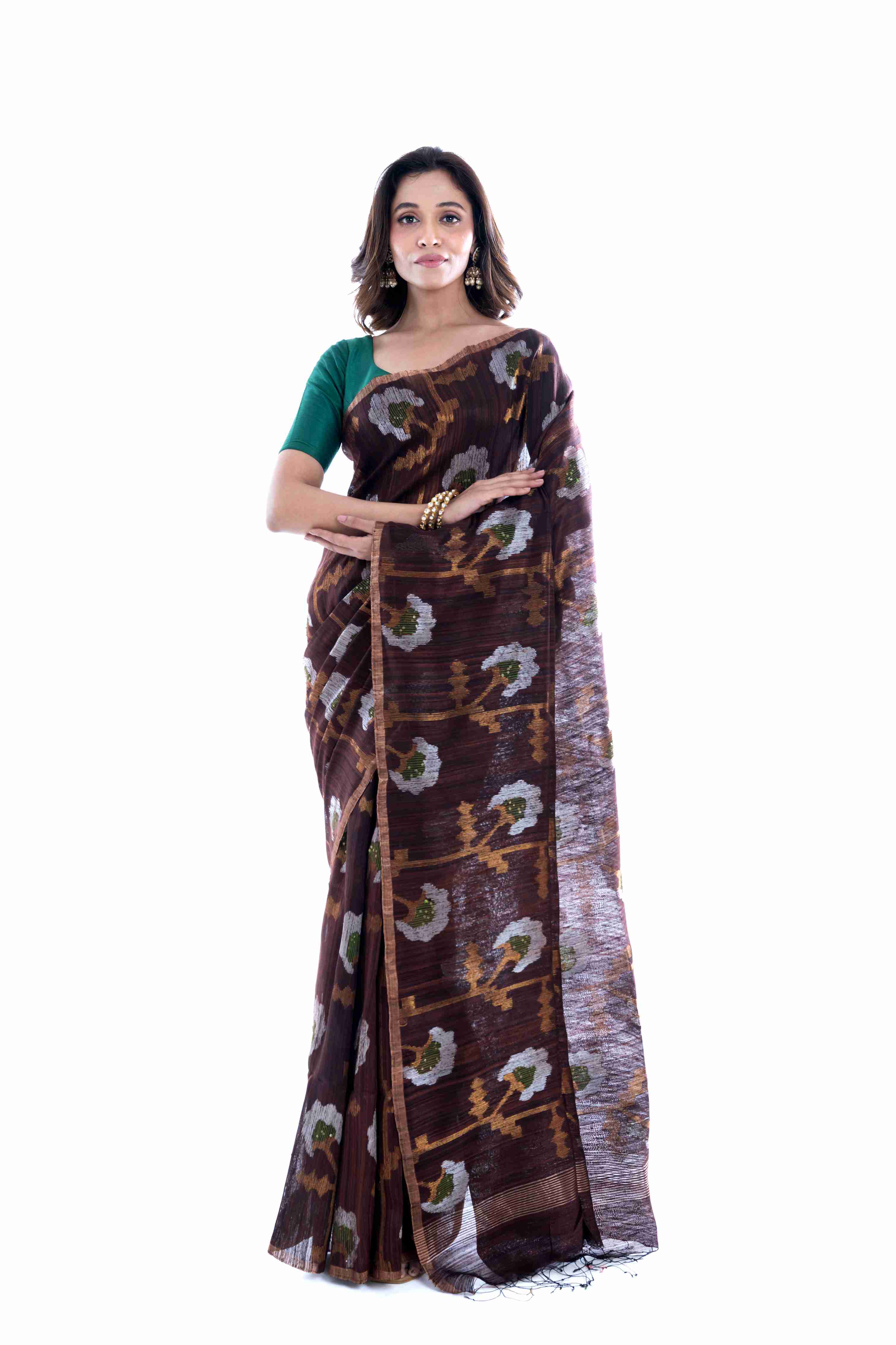 Woven by skilled artisans, the Jamdani patterns enhance its rich texture, making it perfect for festive wear, weddings, and special occasions.