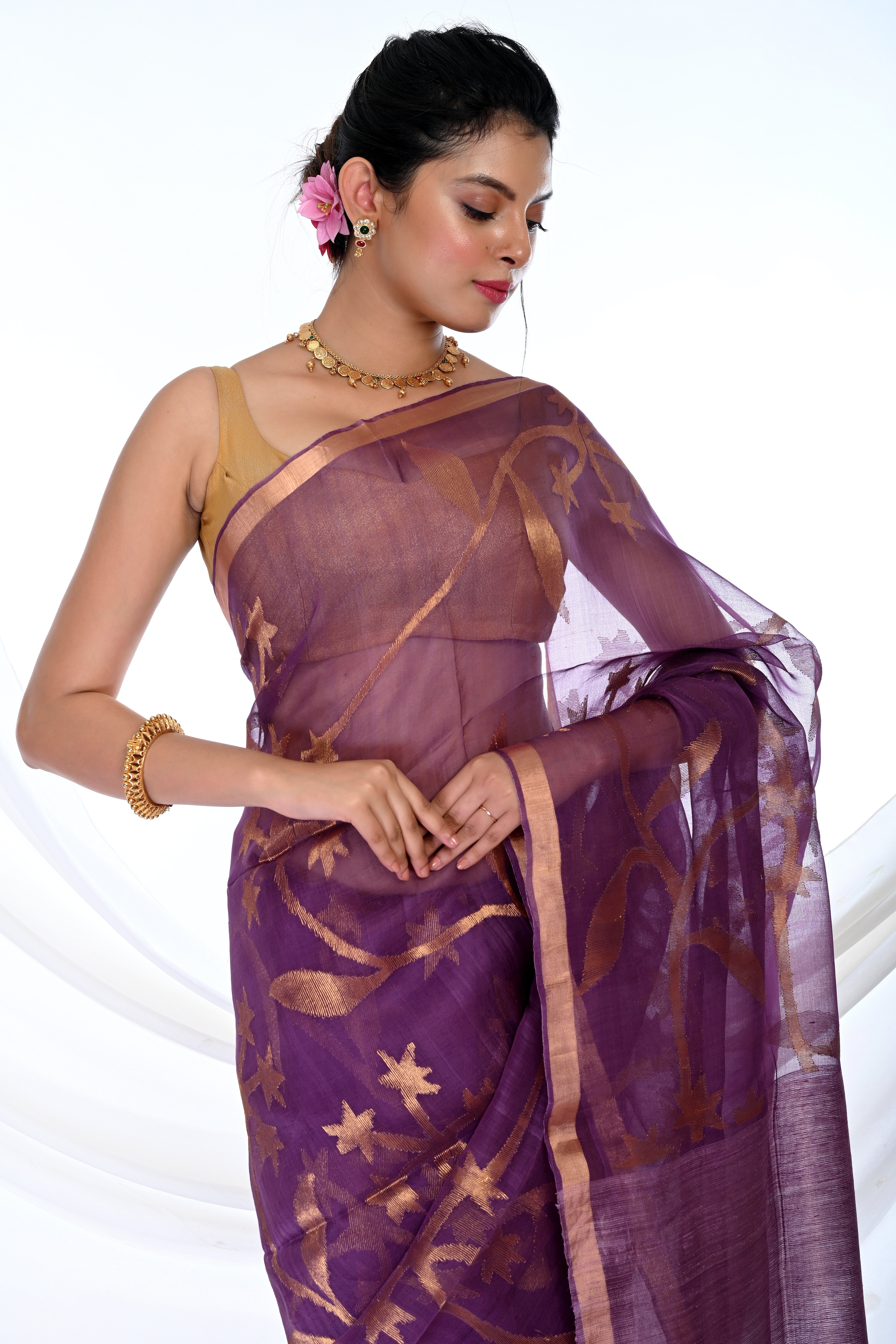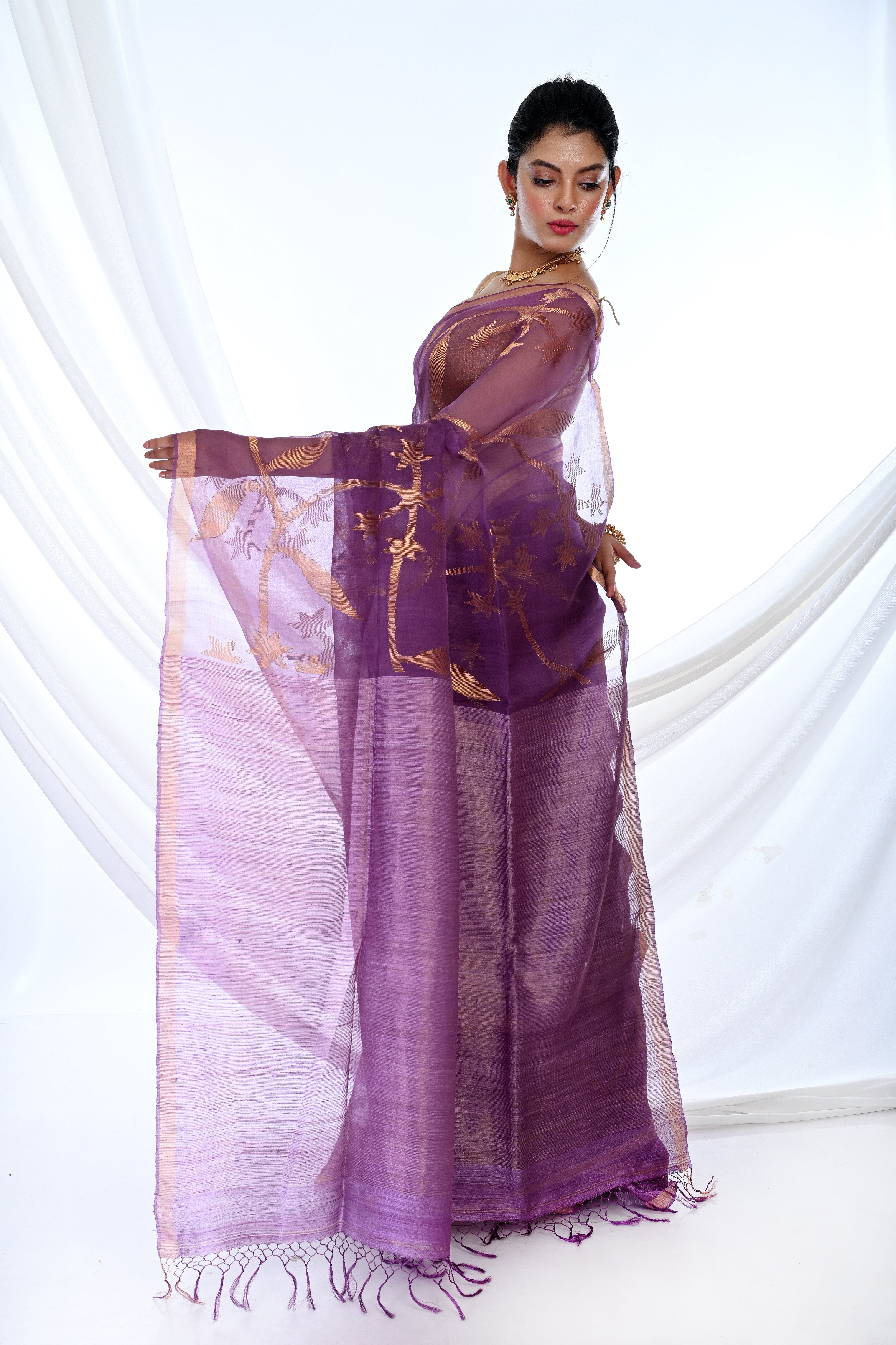Elevate your ethnic elegance with our Pure Muslin Allover Purple Jamdani Saree, a timeless masterpiece crafted for grace and sophistication. Made from the finest muslin fabric, this saree features intricate Jamdani weaving throughout, offering a rich traditional touch with a modern appeal.