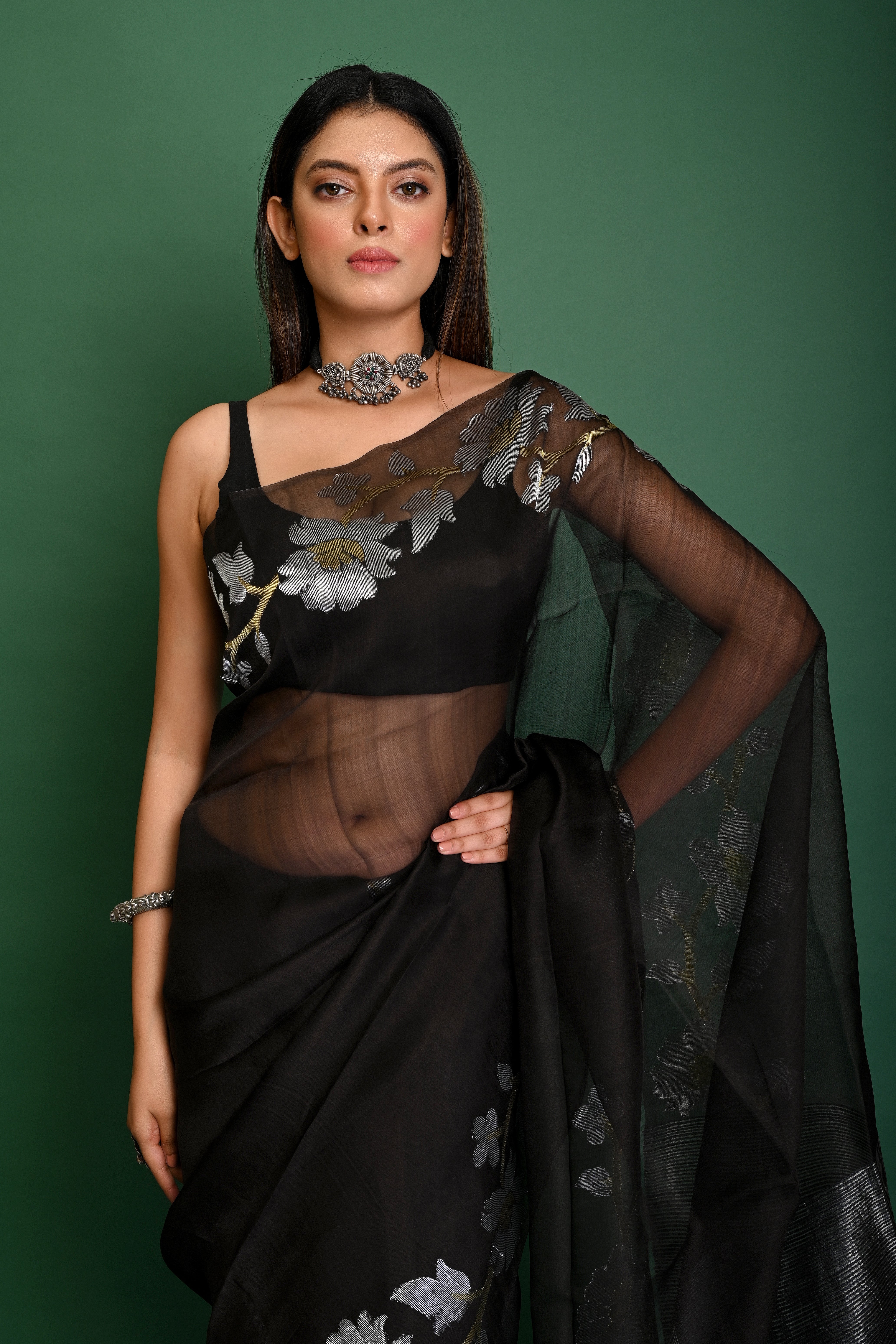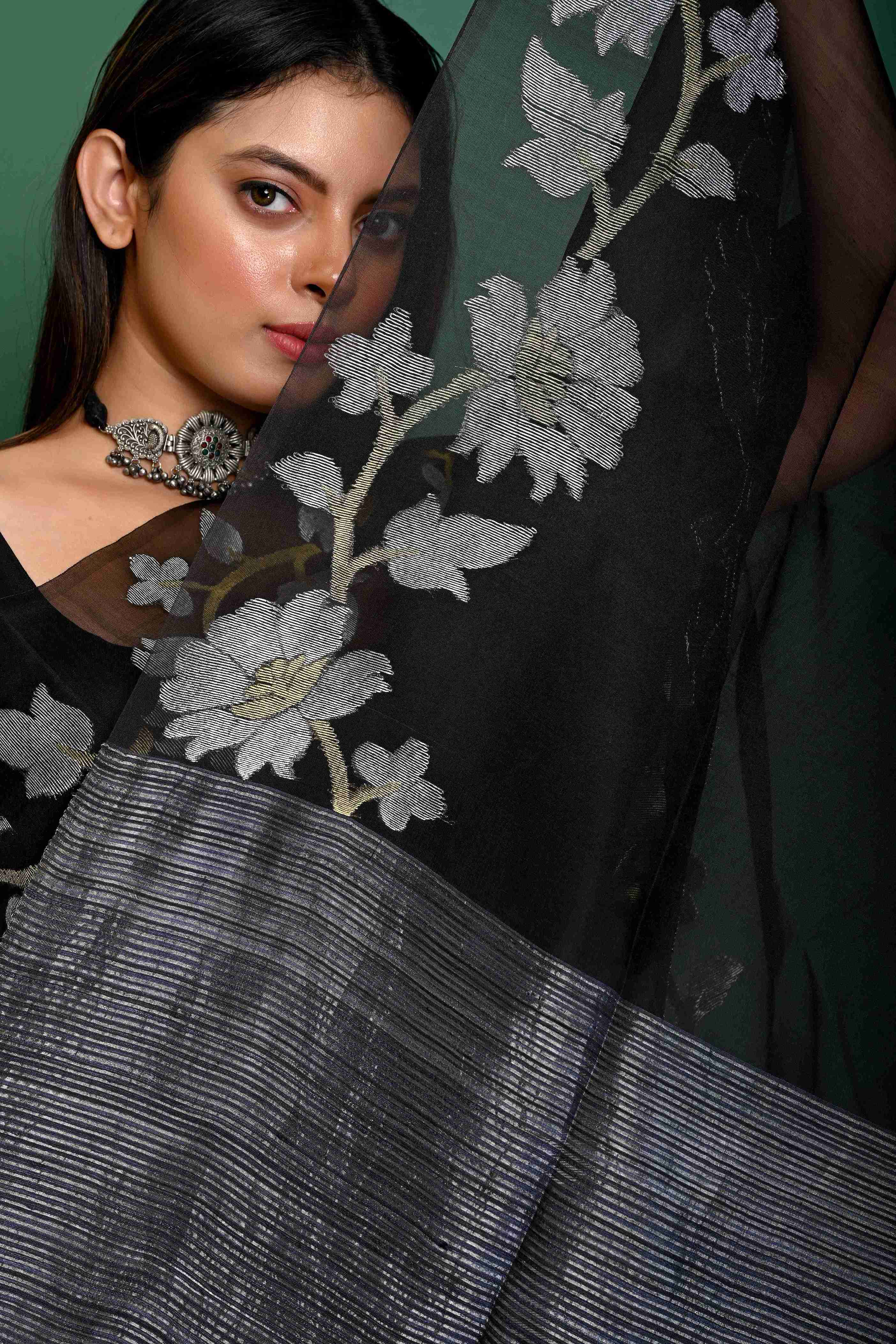 Elevate your ethnic elegance with this Pure Muslin Der Par Silver Zari Lata Jamdani Black Saree, a stunning blend of tradition and grace. Crafted from premium muslin fabric, this saree features intricate silver zari lata work that adds a luxurious touch. Its lightweight and transparent texture offers a delicate, ethereal look—perfect for festive occasions or elegant gatherings.