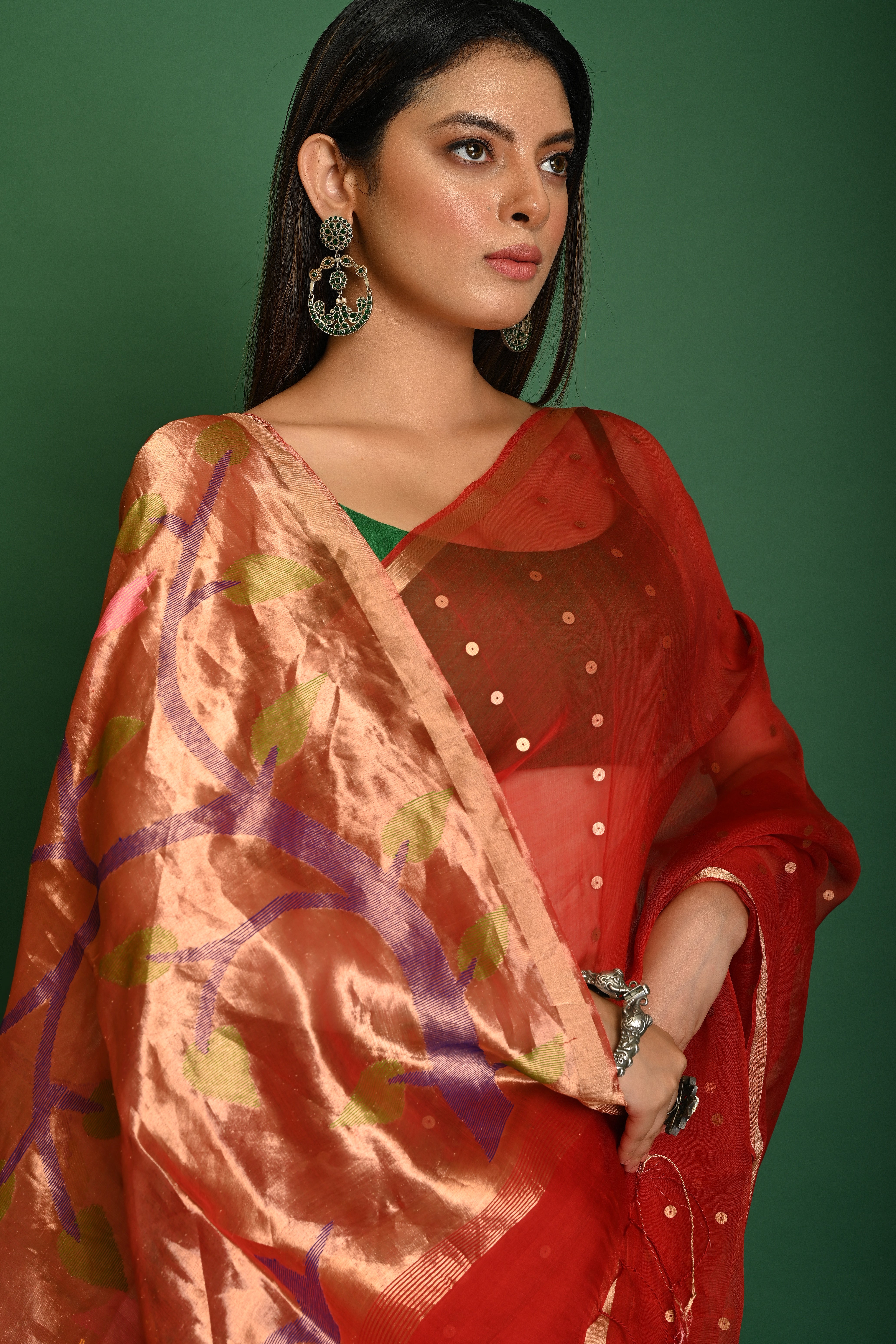 "Drape yourself in elegance with our Pure Muslin Paithani Red Jamdani Saree, a timeless fusion of traditional craftsmanship and contemporary grace. Adorned with intricate body sequins work, this saree radiates subtle shimmer and sophistication. Woven with the finest quality muslin and rich Paithani-style Jamdani patterns, it offers unmatched comfort and style.