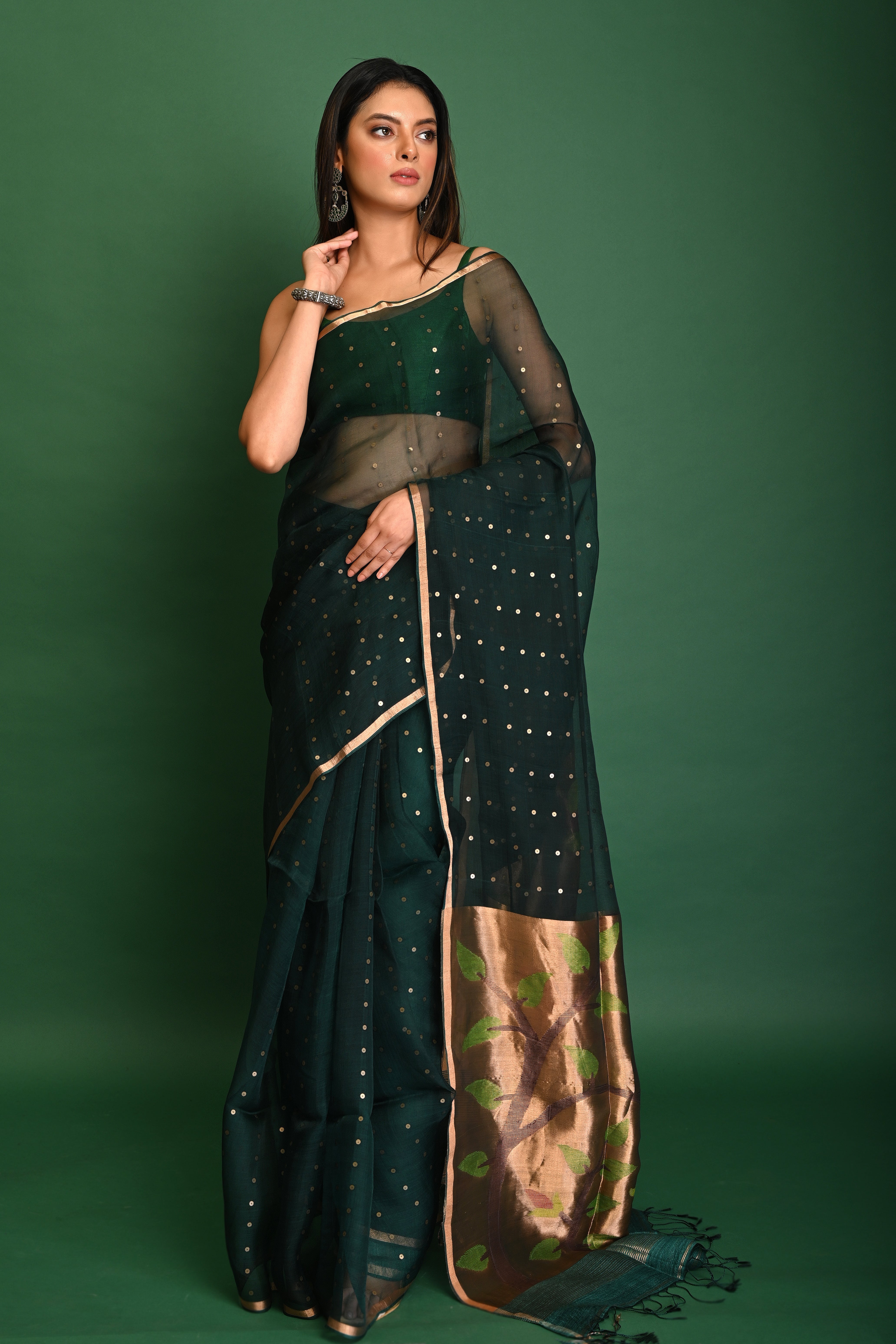 "Drape yourself in elegance with our Pure Muslin Paithani Green Jamdani Saree, a timeless fusion of traditional craftsmanship and contemporary grace. Adorned with intricate body sequins work, this saree radiates subtle shimmer and sophistication. Woven with the finest quality muslin and rich Paithani-style Jamdani patterns, it offers unmatched comfort and style.