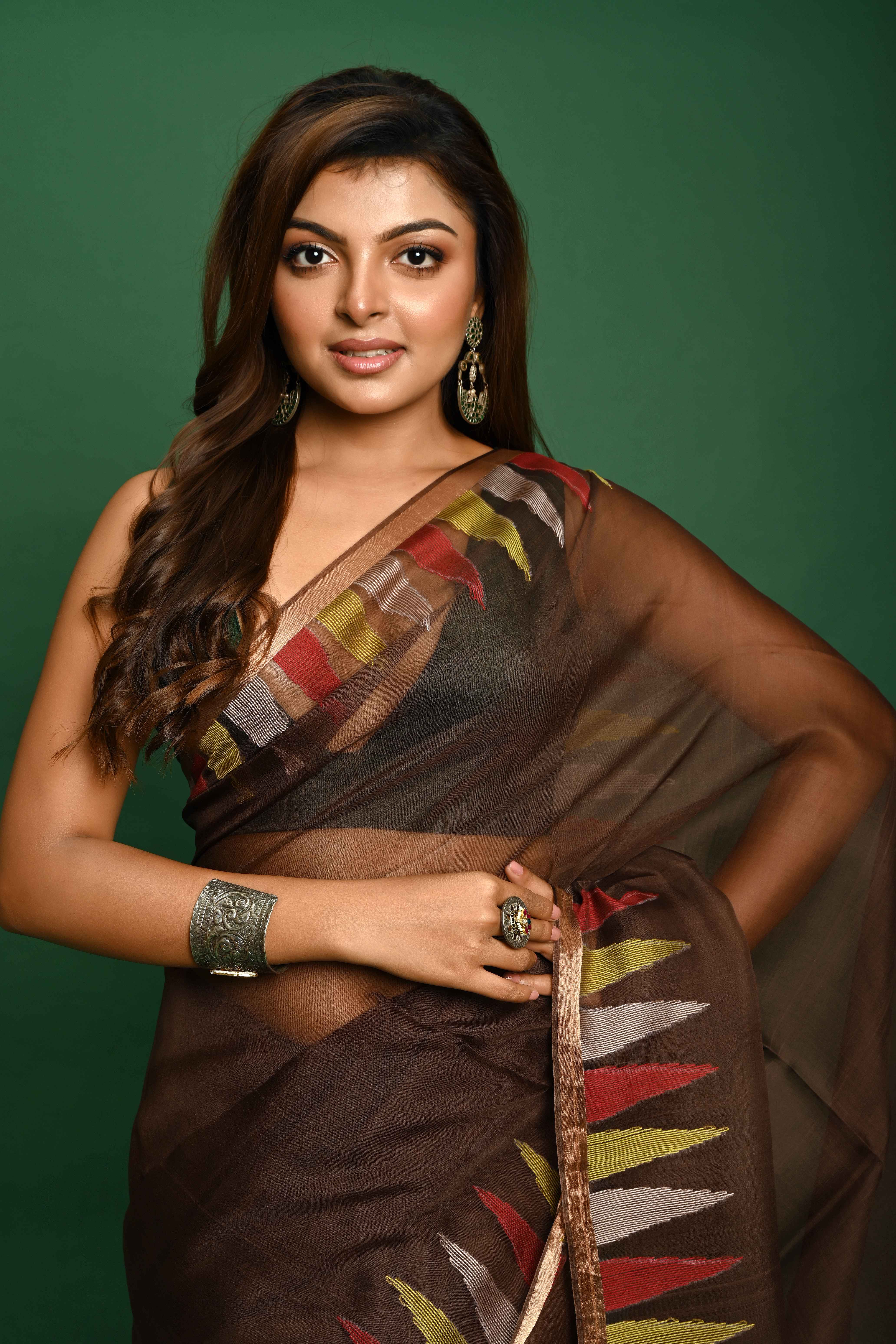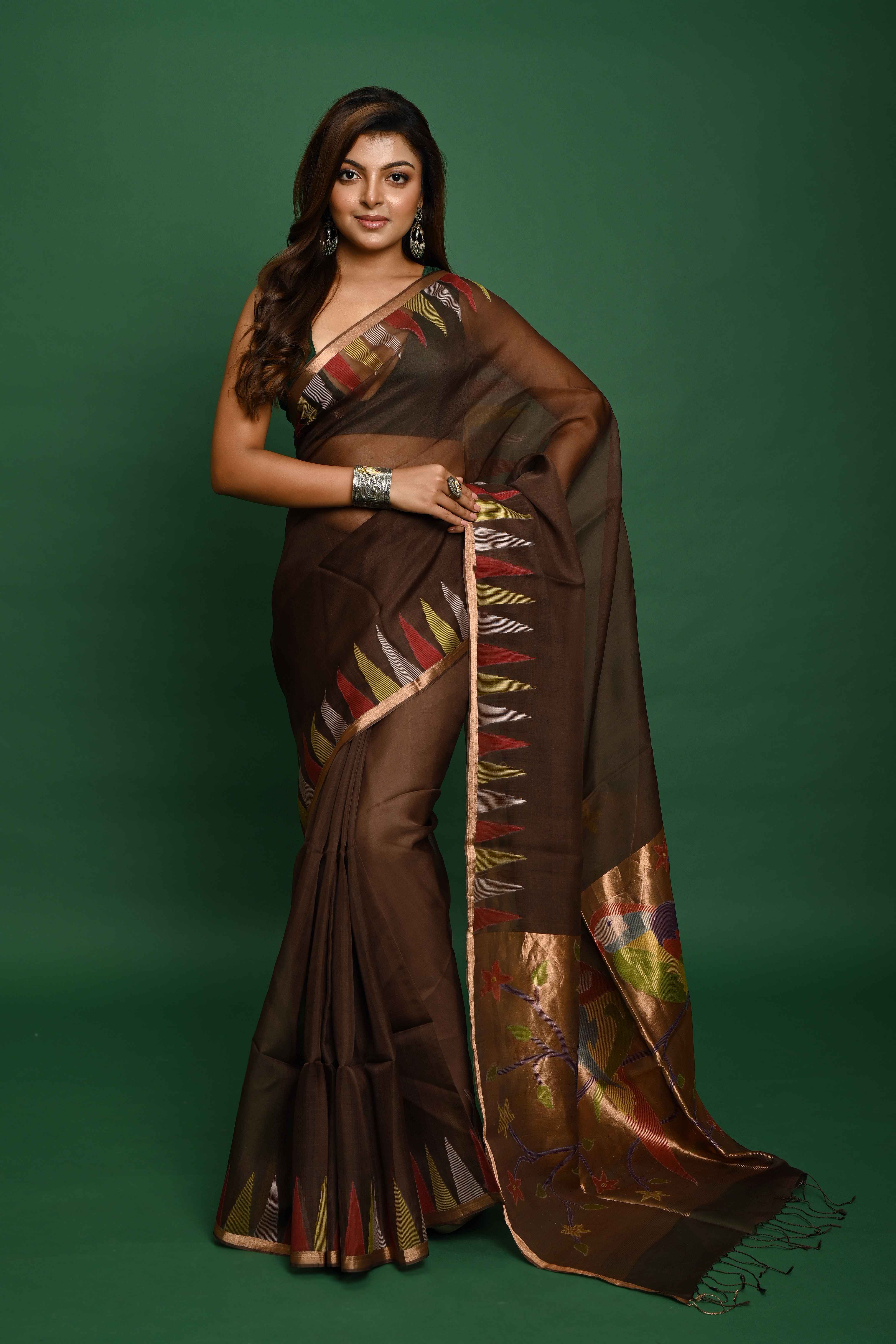 Elevate your traditional wardrobe with this exquisite Pure Muslin Temple Brown Paithani Jamdani Saree. Crafted with finesse and elegance, this saree showcases intricate Jamdani weaving and the timeless beauty of Temple Paithani patterns, symbolizing rich cultural heritage.