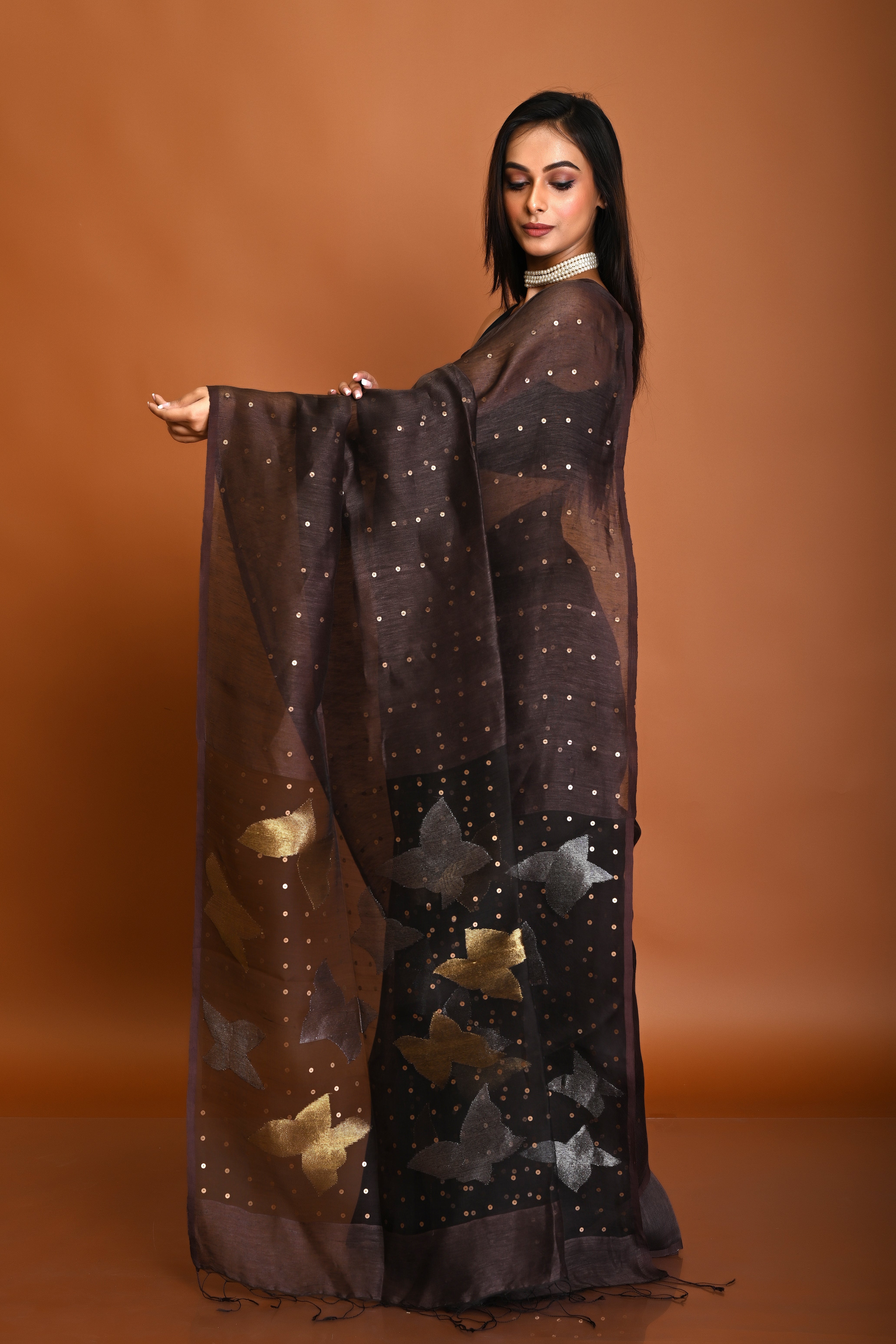 Pure Silk Linen Sequin Pallu Butterfly Jamdani Saree