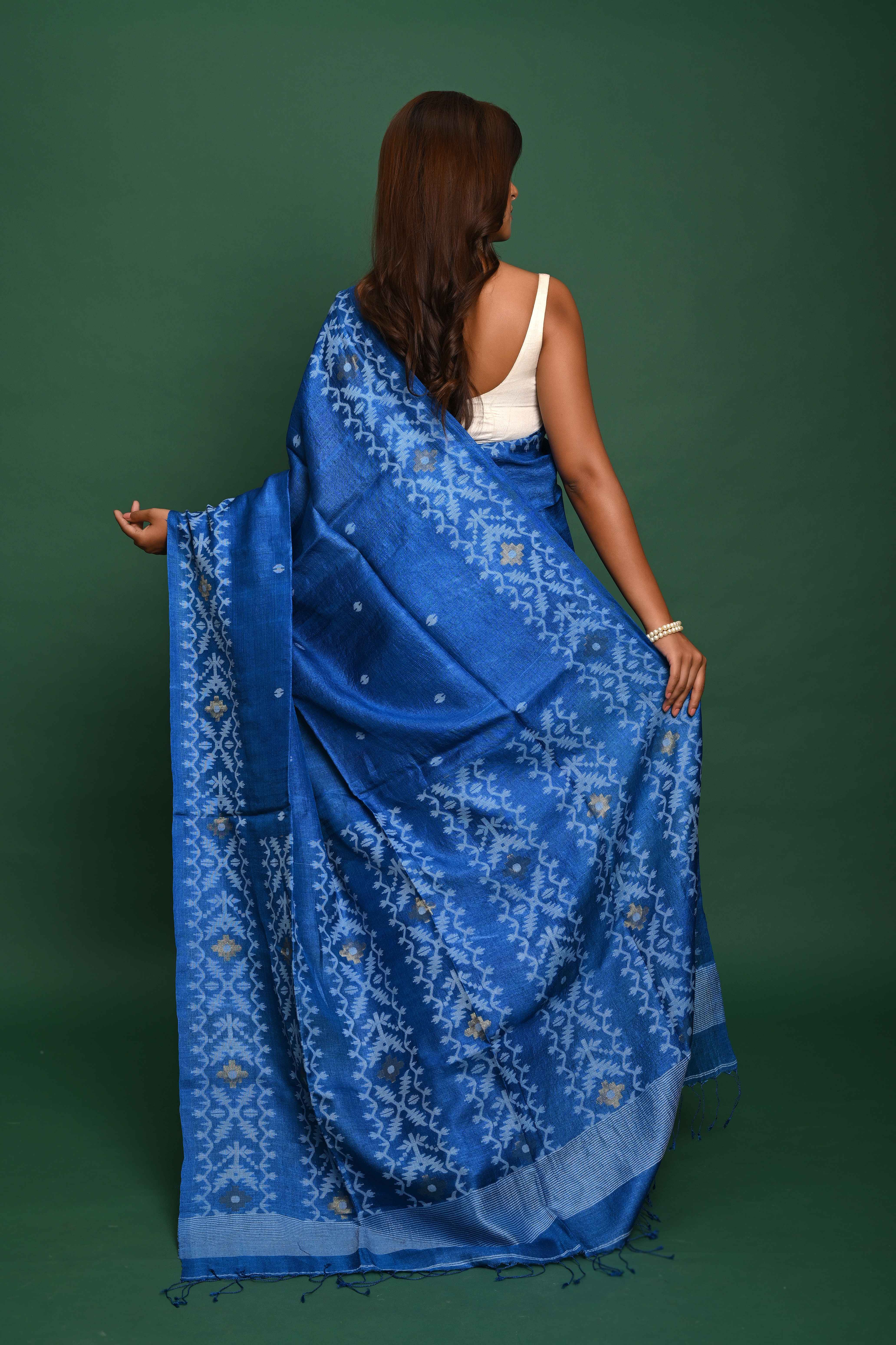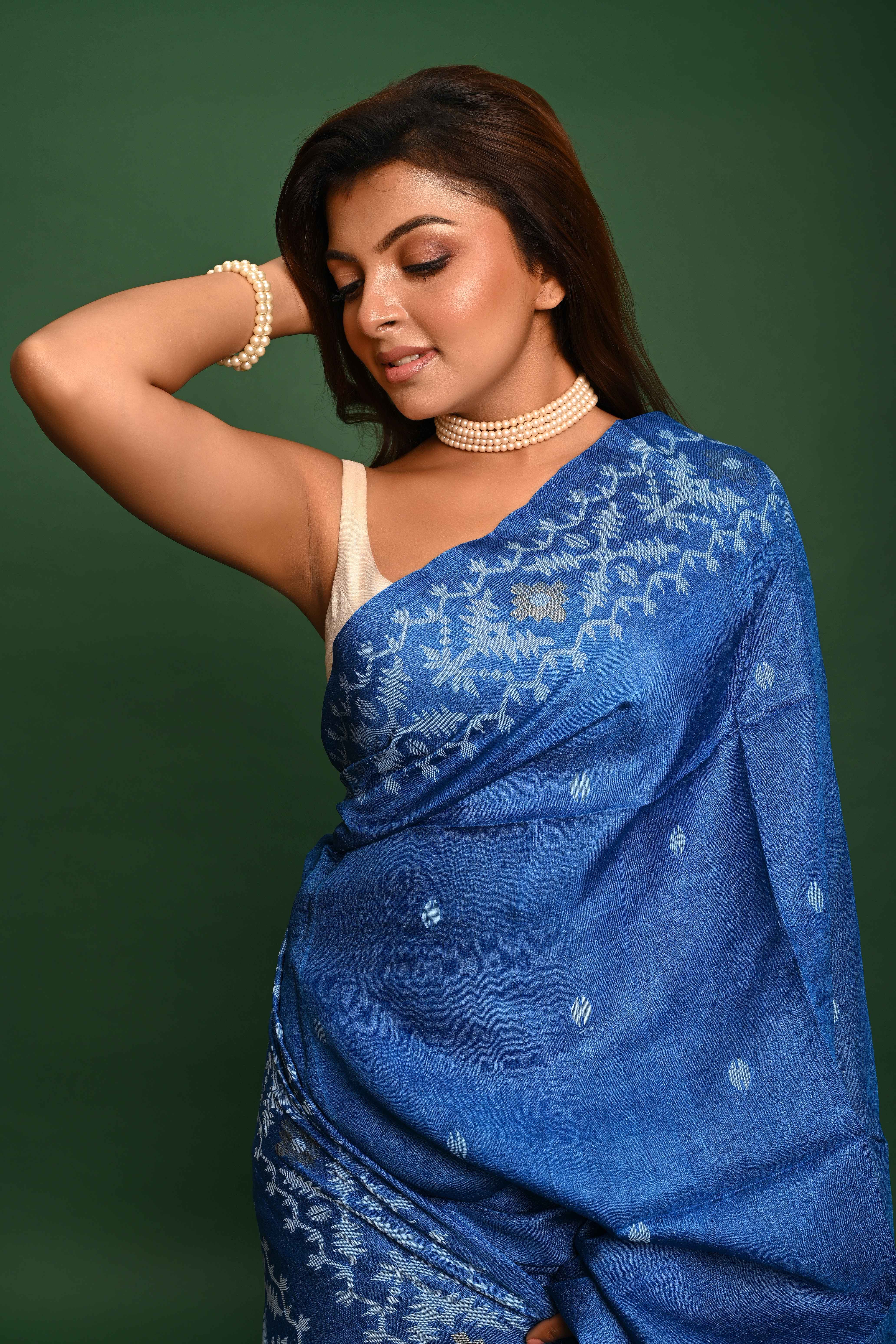 Elevate your ethnic wardrobe with this exquisite Pure Tussar Blue Jamdani Saree, a perfect blend of tradition and elegance. Crafted with precision and adorned with classic Jamdani weaving, this saree showcases timeless craftsmanship on premium Tussar silk fabric.