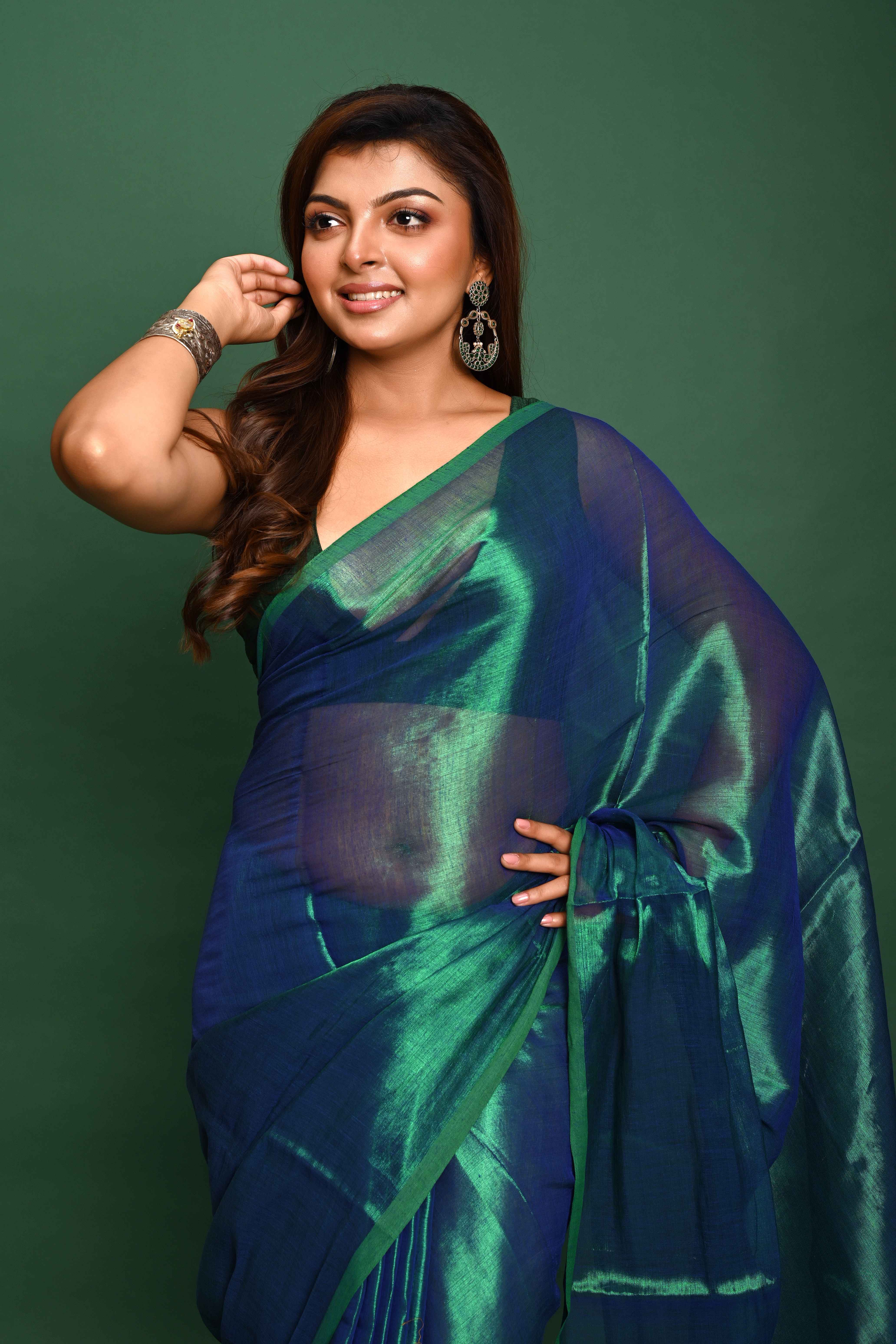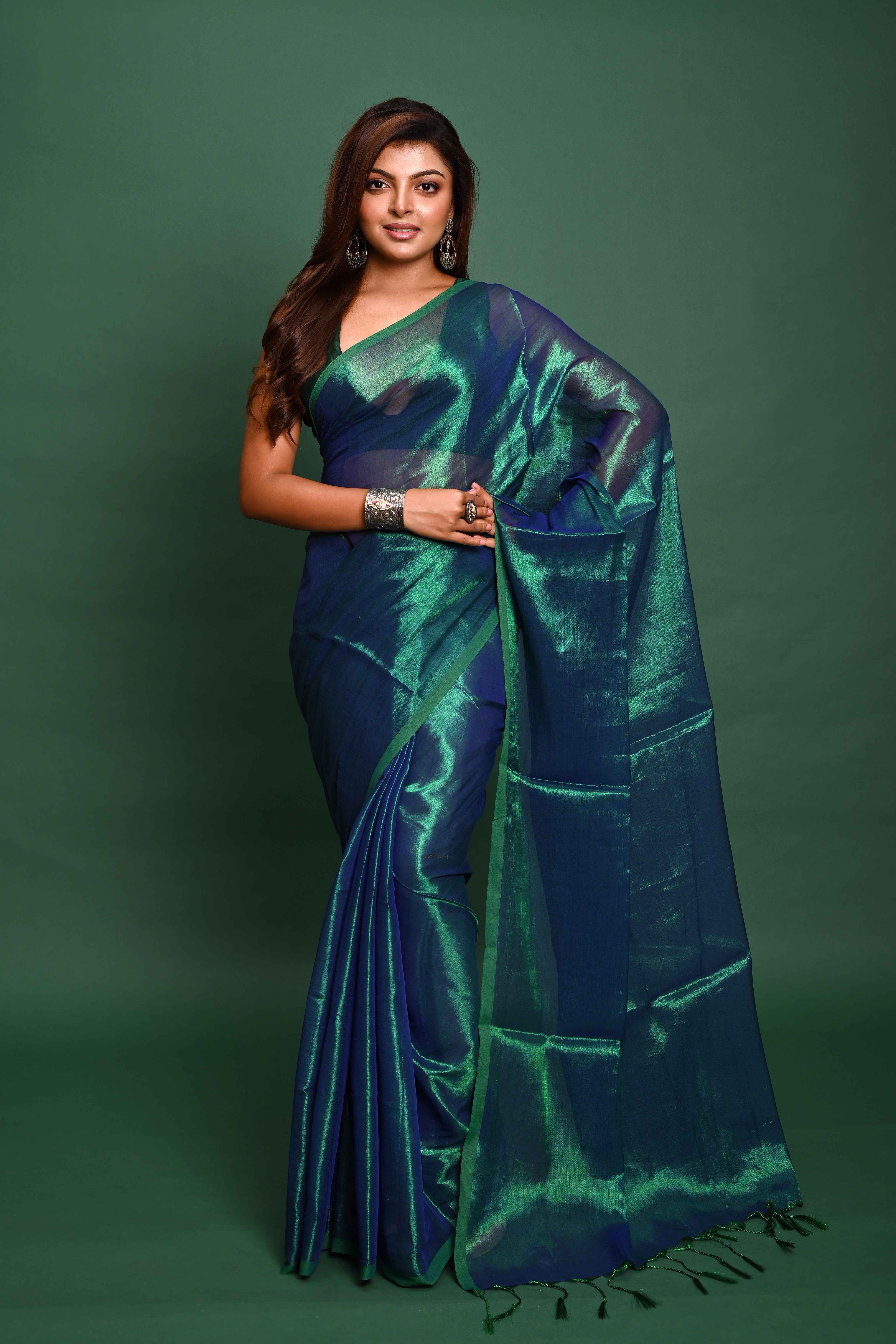 Draped in regal elegance, the Rama Green Tissue Saree is woven from lustrous tissue fabric that radiates a soft, shimmering glow. Measuring 6.5 metres (with blouse piece included), this saree combines lightweight comfort with luxe appeal. Its rich purple hue is accentuated by subtle finishing details that catch the light gracefully—ideal for weddings, festive gatherings, or any occasion where you want to stand out with understated glamour.